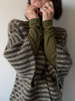 Virginia – это интерпретация классического жакета Ringe, автором которого была известный дизайнер Марианна Исагер, и вклад Karoline Skovgaard Bentsen в коллекцию Isager Archives 2. Тот жакет представлял собой модель прилегающего силуэта с длинными узкими рукавами и был связан необычным мозаичным узором. Karoline сохранила начальную идею жакета, но уже в современной интерпретации: Virginia – модель свободного силуэта, больше похожая на кейп, выполненная интересным двухцветным мозаичными узором и полосами.