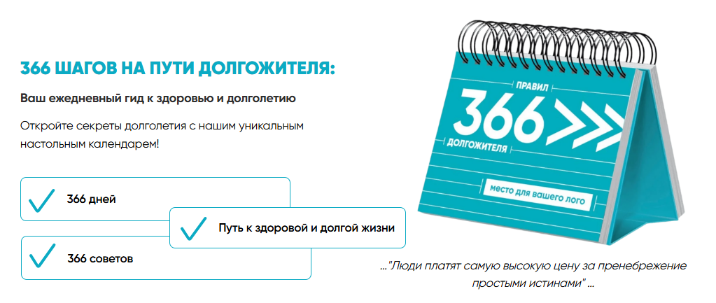 Наш настольный календарь «366 шагов на Пути долгожителя» — это не просто календарь, это ваш личный ежедневный консультант по здоровью и долголетию