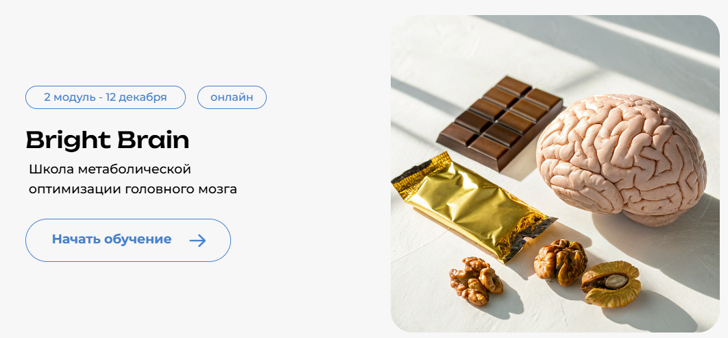 Школа метаболической оптимизации мозга Bright Brain — проект для врачей любых специальностей, посвящённый комплексной работе с функциями головного мозга, профилактике и коррекции нейрометаболических нарушений, а также менеджменту когнитивных, аффективных и нейродегенеративных состояний. Программа обучает интегральным подходам к ранней диагностике, профилактике и восстановлению функций мозга.