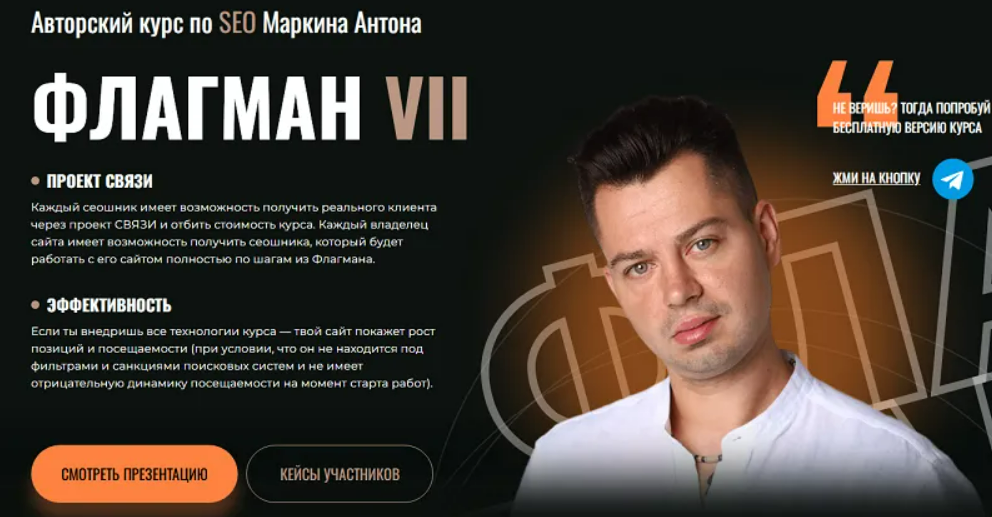 Мои курсы особенно ценны для тех, кто уже проходил другие курсы и разочаровался. "Флагман" учит не сказкам, а настоящему SEO основанному на практике с 2011 года, программа обучения от построения структуры сайта до взятия топа.