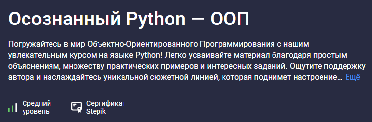 Погружайтесь в мир Объектно-Ориентированного Программирования с нашим увлекательным курсом на языке Python! Легко усваивайте материал благодаря простым объяснениям, множеству практических примеров и интересных заданий. Ощутите поддержку автора и наслаждайтесь уникальной сюжетной линией, которая...stepik.org