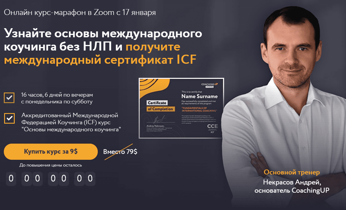 Наш курс имеет международную аккредитацию уровня CCE от крупнейшей в мире Международной федерации коучинга ICF.