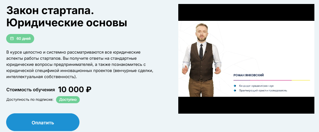 Курс отвечает, с одной стороны, на стандартные юридические вопросы предпринимателей, с другой стороны, в нем предусмотрены разделы, посвященные именно инноваторам (венчурные сделки, интеллектуальная собственность). Благодаря изучению курса, вы получите ответы на все потенциальные вопросы технологического предпринимателя по законодательному регулированию деятельности и сможете свести знания по ним в единую систему.