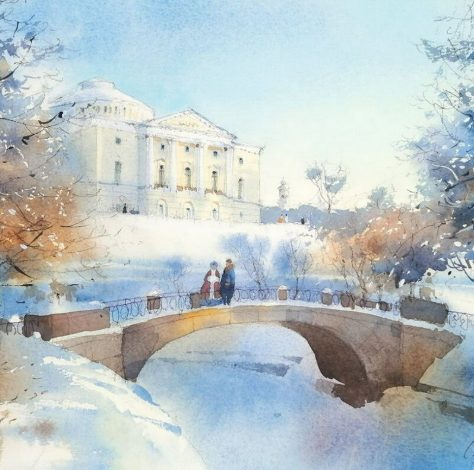 Четыре разноплановых сюжета, связанные общей темой «человек в пейзаже», и отличающиеся своими акварельными приемами, которыми щедро поделится Сергей Курбатов! Начнём с диалога двух эпох на фоне залитого солнцем дворца в Павловске. Затем погрузимся в тишину зимней берёзовой рощи, где человек — лишь часть её заснеженной гармонии. В третьем уроке запечатлим катание с горки веселой толпы. И закончим марафон добрым сюжетом, на котором дети делятся угощением с синичками.