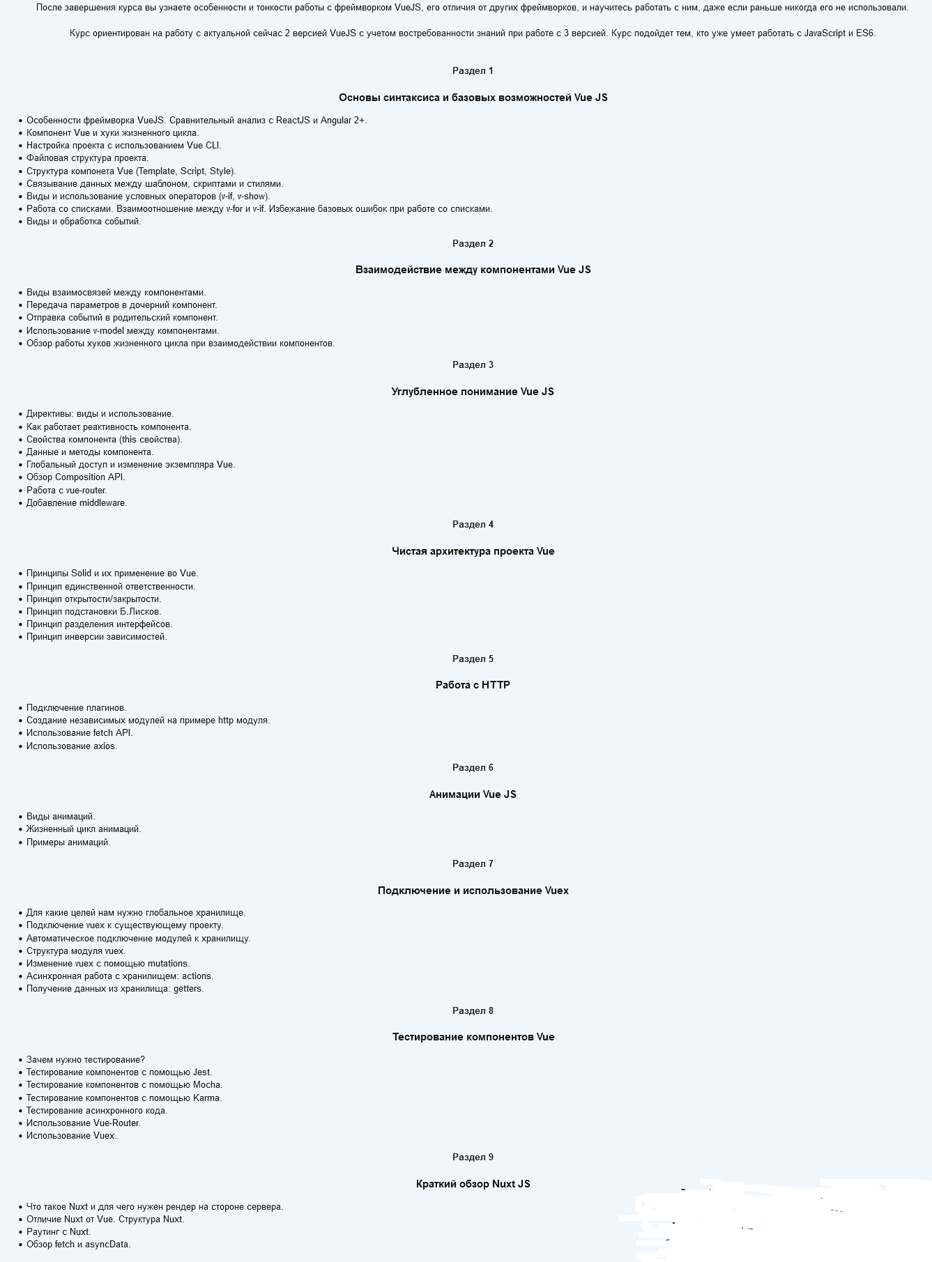 После завершения курса вы узнаете особенности и тонкости работы с фреймворком VueJS, его отличия от других фреймворков, и научитесь работать с ним, даже если раньше никогда его не использовали. Курс ориентирован на работу с актуальной сейчас 2 версией VueJS с учетом востребованности знаний при работе с 3 версией. Курс подойдет тем, кто уже умеет работать с JavaScript и ES6.