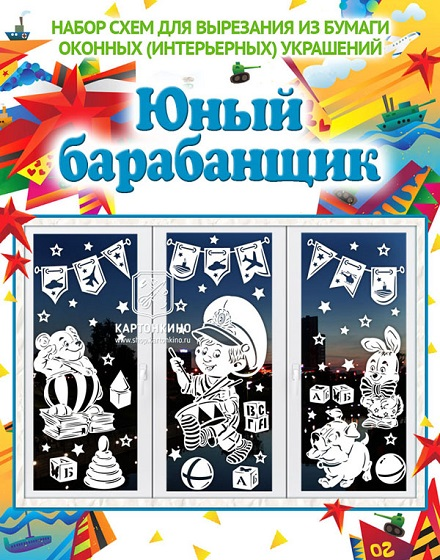 Данный набор шаблонов для вырезания из бумаги поможет Вам изготовить забавную композицию с бравым барабанщиком для украшения окна (или других участков интерьера) к празднику 23 февраля.