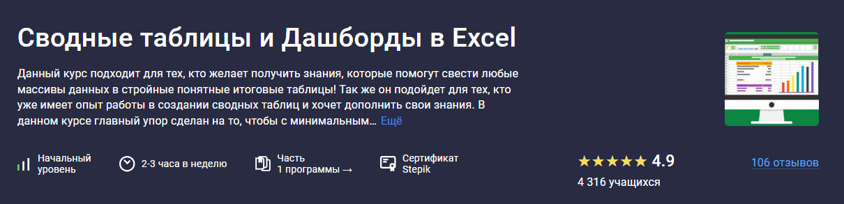 - При должном терпении и усилиях, которые вы приложите при обучении незамедлительно дадут хорошую практическую базу для работы со Сводными таблицами и Дашбордами.
