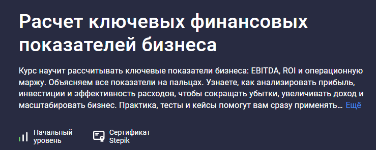 Курс научит рассчитывать ключевые показатели бизнеса: EBITDA, ROI и операционную маржу. Объясняем все показатели на пальцах. Узнаете, как анализировать прибыль, инвестиции и эффективность расходов, чтобы сокращать убытки, увеличивать доход и масштабировать бизнес. Практика, тесты и кейсы помогут...stepik.org