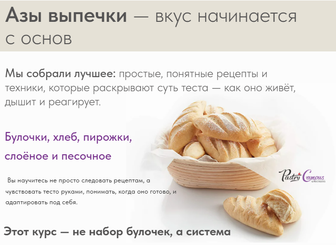 Булочки, хлеб, пирожки, слойки — вы освоите всё, что нужно для уверенного старта в пекарском деле.
