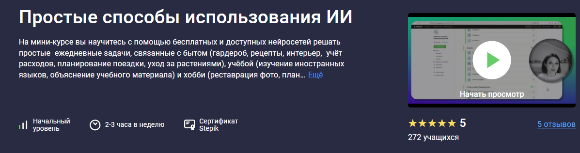 На мини-курсе вы научитесь с помощью бесплатных и доступных нейросетей решать простые ежедневные задачи, связанные с бытом (гардероб, рецепты, интерьер, учёт расходов, планирование поездки, уход за растениями), учёбой (изучение иностранных языков, объяснение учебного материала) и хобби...stepik.org