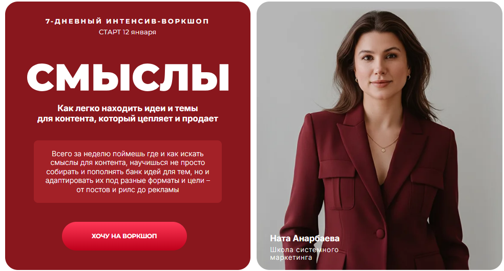 - Именно для этого я провожу воркшоп «Смыслы», чтобы ты перестал ждать музу и понял, как строится продающий контент.