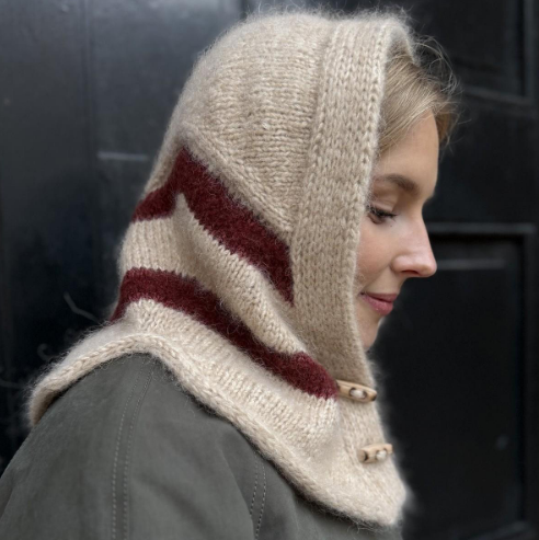 Для вязания капюшона Karen используется пряжа трех цветов. Для основного цвета выбрана 1 нить шерстяной пряжи вместе с 1 нитью мохера на шелке, это одна из самых удачных комбинаций пряжи. Для тонких полос-переходов от одного цвета к другому используется шерстяная пряжа (4 нити тонкой шерстяной пряжи), а для широких полос – фактурная буклированная нить из альпака.