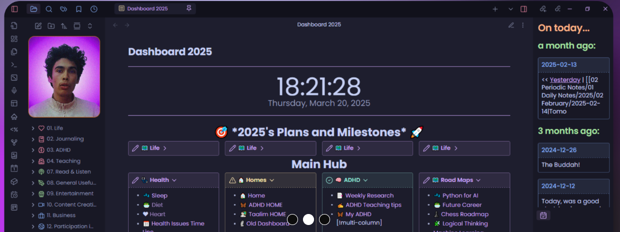 - Journaling: Daily Journaling: Я использую плагины Calendar и Periodic Notes для создания ежедневных, еженедельных, ежемесячных и годовых записей. Это помогает мне рефлексировать над мыслями, задачами и опытом.