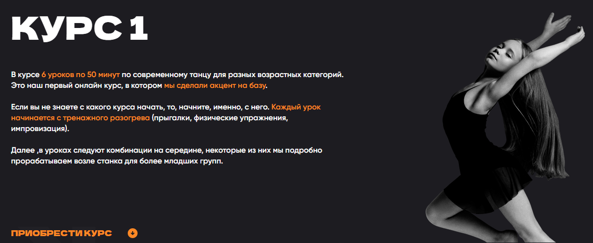В курсе 6 уроков по 50 минут по современному танцу для разных возрастных категорий.
