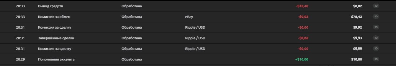 4. Совершаем одну любую сделку (Например: покупаем XRP на 1$ и тут же продаем)