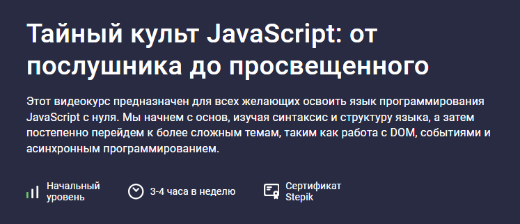 Этот видеокурс предназначен для всех желающих освоить язык программирования JavaScript с нуля. Мы начнем с основ, изучая синтаксис и структуру языка, а затем постепенно перейдем к более сложным темам, таким как работа с DOM, событиями и асинхронным программированием.stepik.org