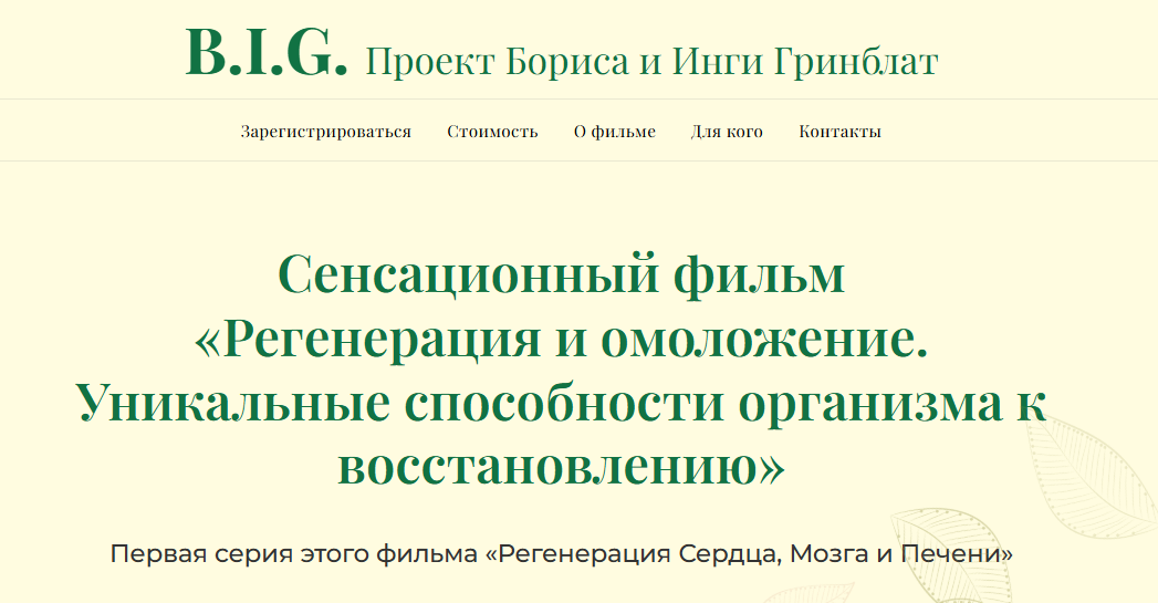 B.I.G. Проект Бориса и Инги Гринблат. Фильм состоит из нескольких видео лекций Сайера Джи, автора революционной книги «Регенерация. Раскрытие уникальной способности к восстановлению вашего тела с помощью Новой Биологии».