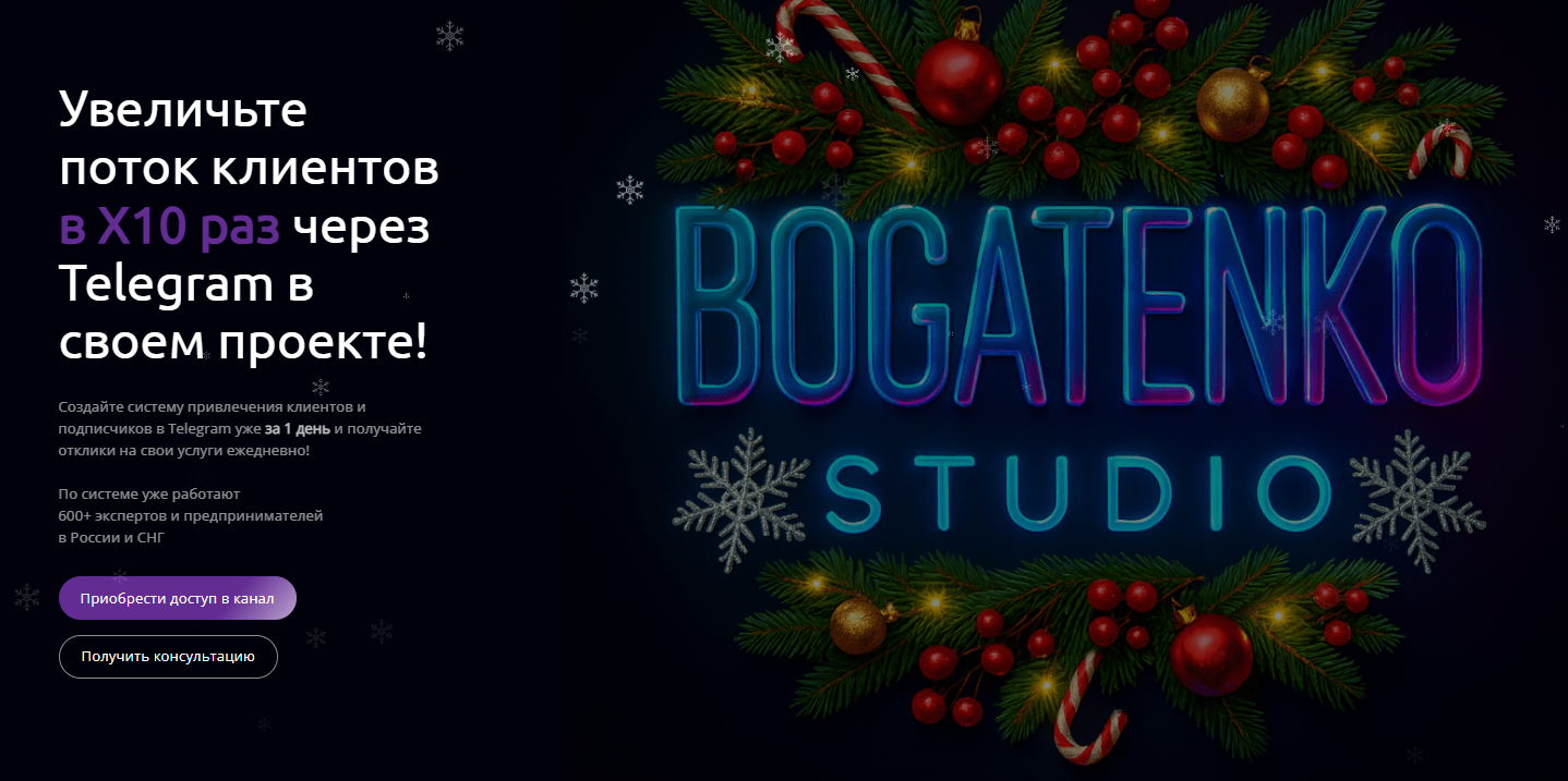 Привлекайте подписчиков и клиентов через Telegram уже сегодня! Закрытая система без сложных воронок и прогревов для экспертов и предпринимателей. Только практика и проверенные инструменты!bogatenkostudio.ru