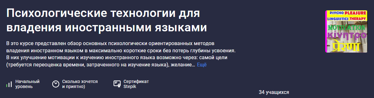 В это курсе представлен обзор основных психологически ориентированных методов владения иностранном языком в максимально короткие сроки без потерь глубины усвоения. В них улучшение мотивации к изучению иностранного языка возможно через: самой цели (требуется переоценка времени, затраченного на...stepik.org