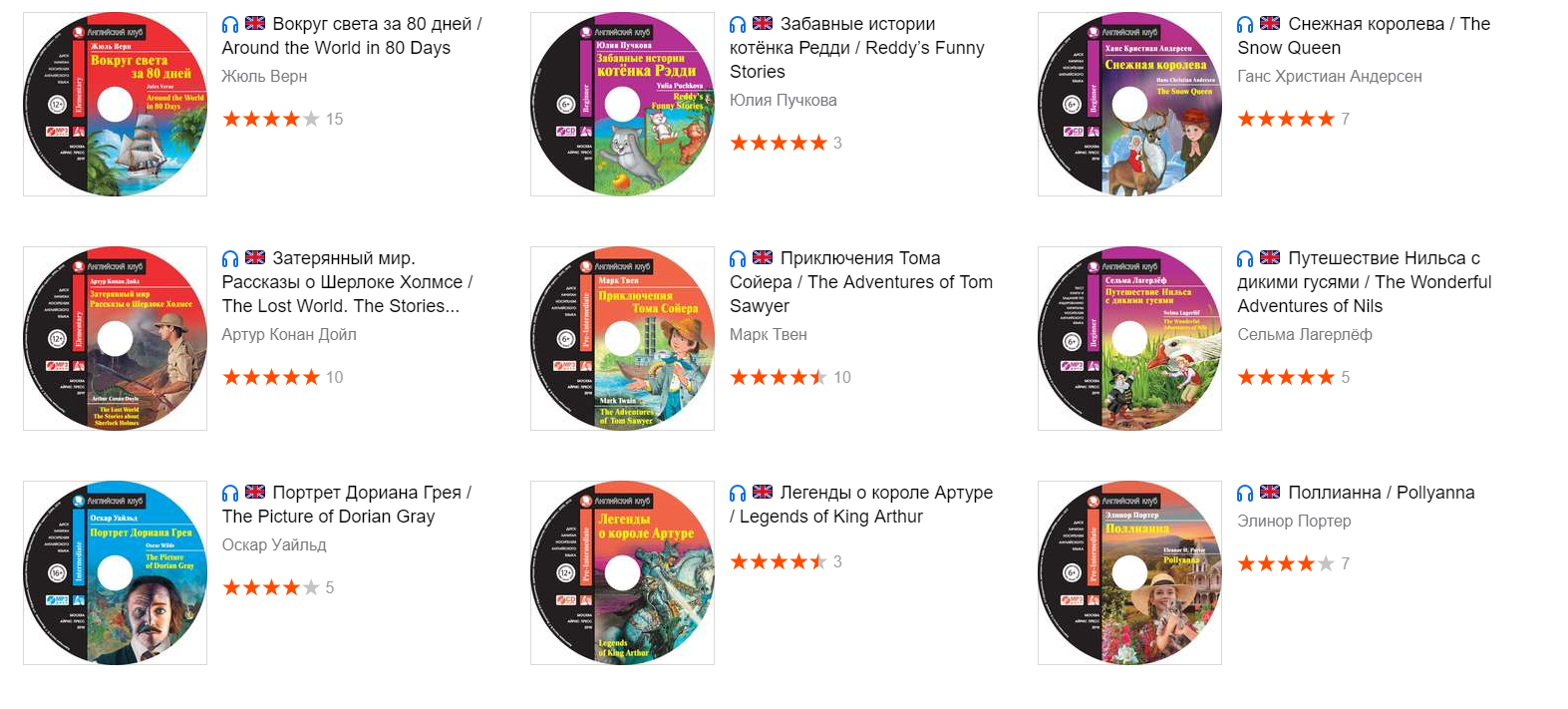 Серия аудиокниг «Английский клуб. Домашнее чтение» - это адаптация произведений знаменитых писателей: Марк Твен, Артур Конан Дойл, Ганс Христиан Андерсен, Джеймс Фенимор Купер, Дэвид Герберт Лоуренс, Майн Рид, О. Генри, Редьярд Киплинг, Сельма Лагерлёф, Фрэнсис Элиза Бёрнетт, Шарль Перро, Эдит Несбит, Элинор Портер, Анна Сьюэлл, Антоний Погорельский, Жюль Верн, Оскар Уайльд, Уильям Мейкпис Теккерей, Уильям Шекспир, Юлия Пучкова и др.