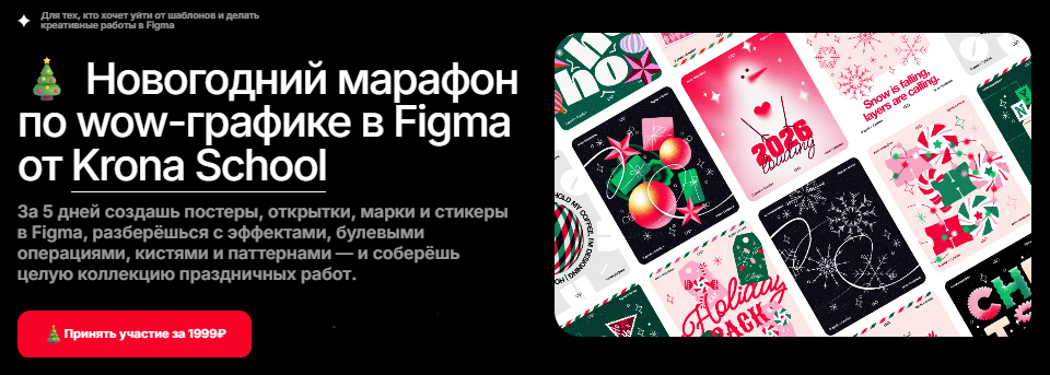 За 5 дней создашь постеры, открытки, марки и стикеры в Figma, разберёшься с эффектами, булевыми операциями, кистями и паттернами — и соберёшь целую коллекцию праздничных работ.school.krona.studio