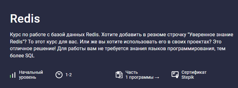 Онлайн-курс «Redis» от преподавателя Максима Крупчатникова на платформе Stepik предназначен для тех, кто хочет освоить работу с популярной базой данных Redis с нуля. Программа рассчитана на начинающих — от слушателей не требуется знаний языков программирования или SQL, что делает курс доступным даже для тех, кто только начинает свой путь в IT.