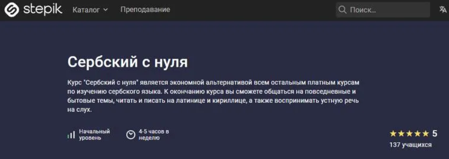 Курс "Сербский с нуля" является экономной альтернативой всем остальным платным курсам по изучению сербского языка. К окончанию курса вы сможете общаться на повседневные и бытовые темы, читать и писать на латинице и кириллице, а также воспринимать устную речь на слух.stepik.org