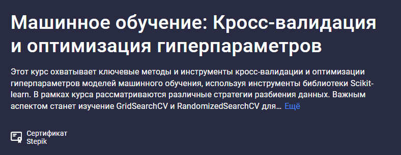 Этот курс охватывает ключевые методы и инструменты кросс-валидации и оптимизации гиперпараметров моделей машинного обучения, используя инструменты библиотеки Scikit-learn. В рамках курса рассматриваются различные стратегии разбиения данных. Важным аспектом станет изучение GridSearchCV и...stepik.org