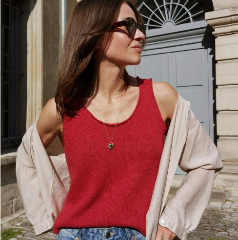 Майка вяжется сверху вниз, поэтому ее длину можно индивидуально регулировать. Передняя часть и спинка вяжутся поворотными рядами до конца пройм, сначала спинка, затем передняя часть. Тело вяжется по кругу лицевой гладью и заканчивается двойной подгибкой. На финальном этапе поднимаются петли по горловине и проймам и вяжутся кромки лицевой гладью, которые естественным образом закручиваются руликом.