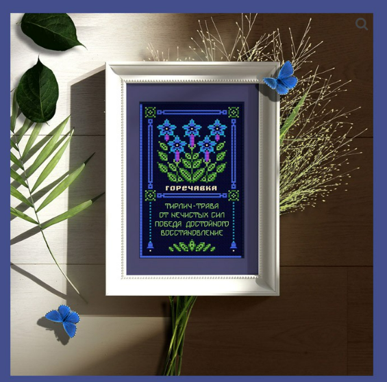 Горечавка находится в шестой ячейке композиции «Купальский травник | Солнцеворот» под номером 26. Но при желании её можно вышить в любой другой. Также этот элемент может быть вышит в любой ячейке первой части композиции «Купальский травник | Цветок папоротника».