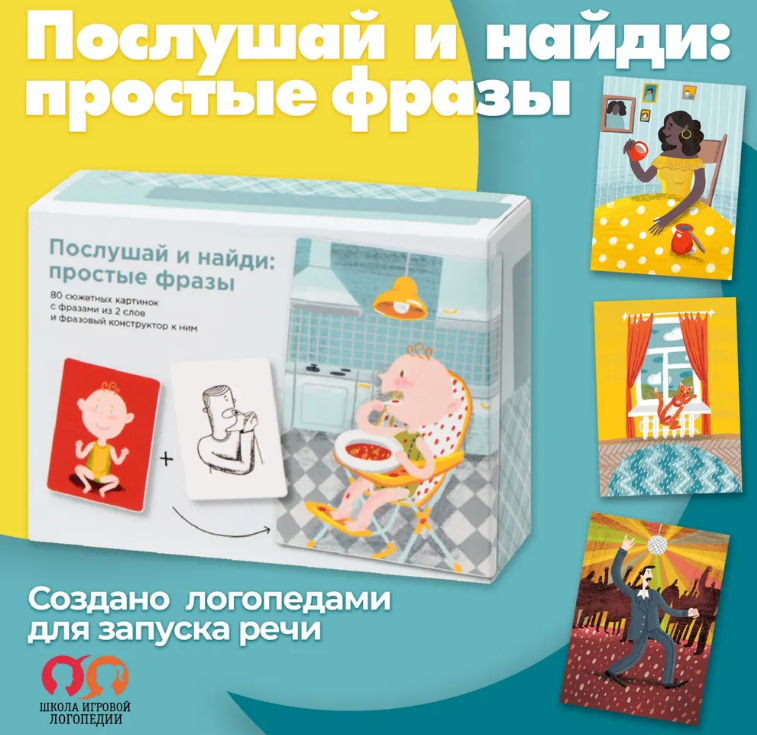 Логопедические карточки «Послушай и найди» познакомят ребенка с 11 базовыми глаголами и научат произносить 80 новых фраз из двух слов.