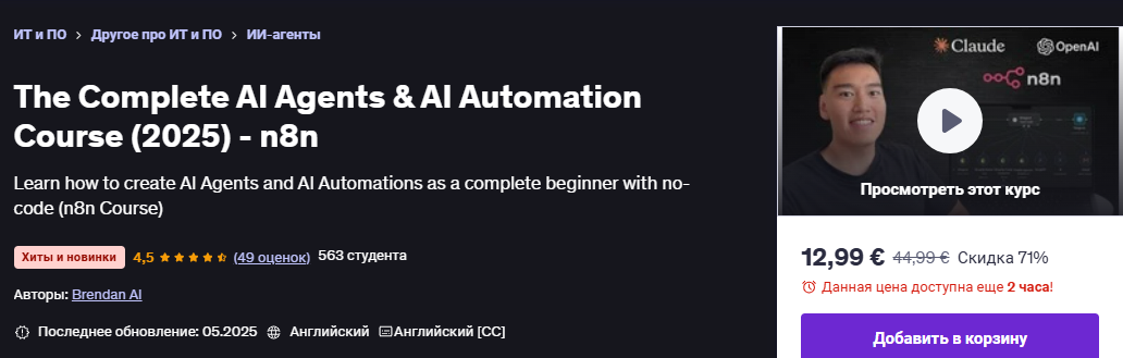 Слив курса Полный курс по агентам ИИ и автоматизации ИИ (2025) - n8n [Udemy] [Брендан AI]