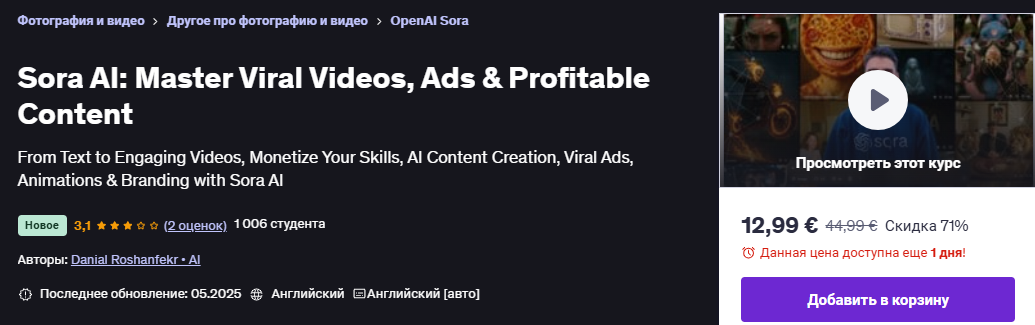 Слив курса Sora AI: мастер вирусных видеороликов, рекламы и прибыльного контента [udemy] [Дэниел Рошенфекр]
