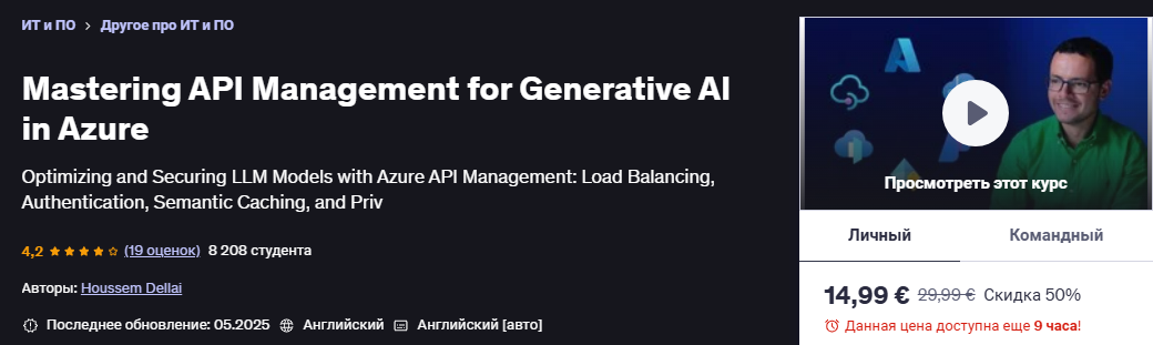 К концу этого курса у вас будет четкое понимание того, как оптимизировать и защищать модели LLM с помощью Azure API Management. Вы будете вооружены лучшими практиками для корпоративной интеграции, что позволит вам использовать мощь генеративного ИИ для стимулирования инноваций и повышения эффективности в вашей организации.