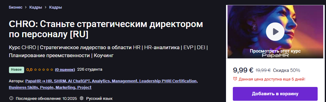 Курс CHRO | Стратегическое лидерство в области HR | HR-аналитика | EVP | DEI | Планирование преемственности | Коучинг