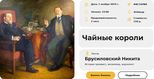 В России XIX века чай пили все и везде – от императора до крестьянина, от Санкт-Петербурга до Владивостока. Неудивительно, что торговля чаем стала весьма доходным предприятием, на котором обогатился целый ряд купеческих фамилий – Перловы, Поповы, Вогау, Стахеевы, Высоцкие и другие. Об этих «чайных королях», их бизнесе и ассортименте продукции, о чайных традициях России и легендах, связанных с ними, мы поговорим на нашей встрече.