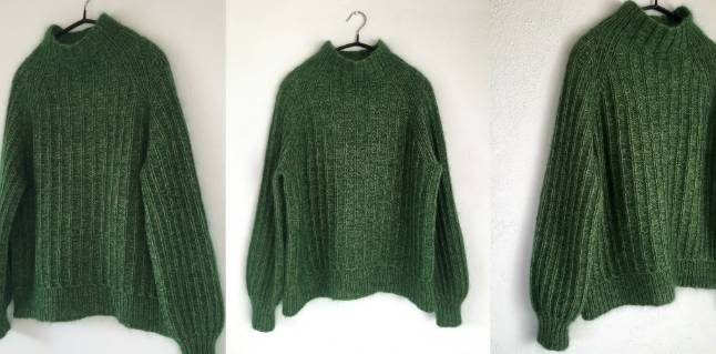 Этот пуловер вяжется спицами по кругу сверху вниз. Воротник стойкой переходит в кокетку регланом, где широкая линия реглана вяжется узкой резинкой, а само тело широкой резинкой. Нить мохера, добавленная к основной нити, сделает этот пуловер не только теплым, но и воздушным.
