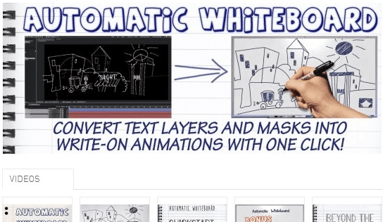 Automatic Whiteboard converts After Effects text layers and masks into write-on animations, automatically! Just type in some text, or draw some masks, and then click a button. Instant whiteboard-style animation, with or without a hand to draw it on.aescripts.com