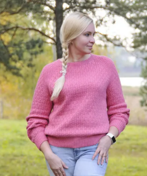 Предлагаемый припуск на свободу облегания на уровне груди: в среднем 8-18 см. Образец на модели связан по описанию размера L-XL со свободой облегания 15 см.