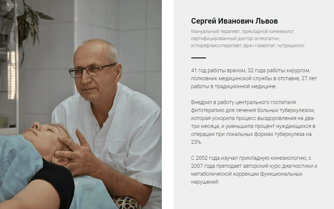Мануальный терапевт, прикладной кинезиолог, сертифицированный доктор остеопатии, иглорефлексотерапевт, врач гомеопат, нутрициолог.