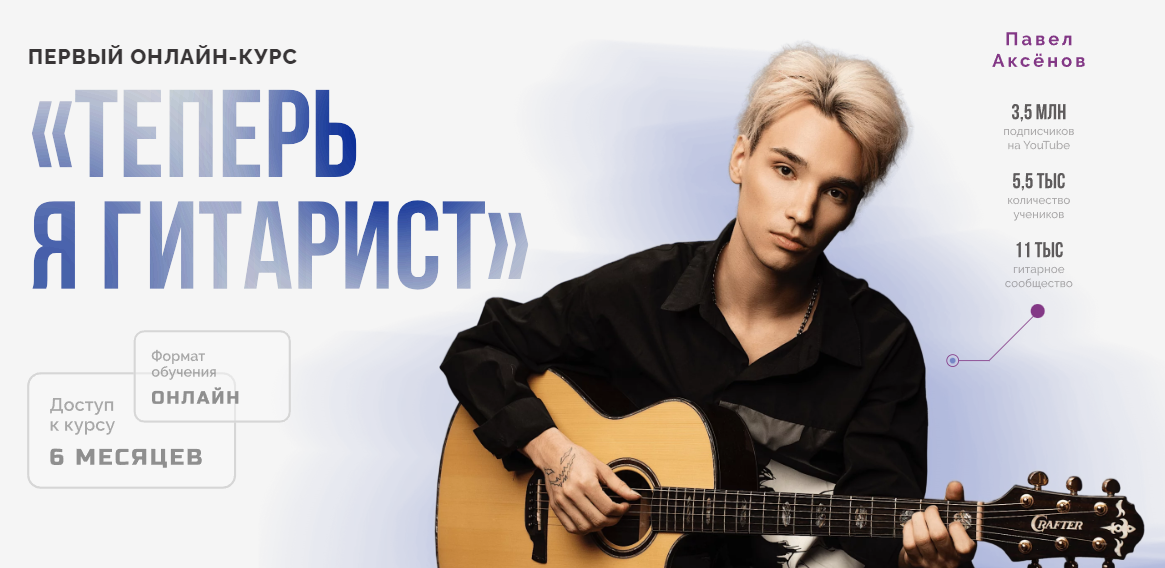 Освоишь базовые навыки игры на гитаре, разучишь первые песни и начнешь карьеру гитариста!