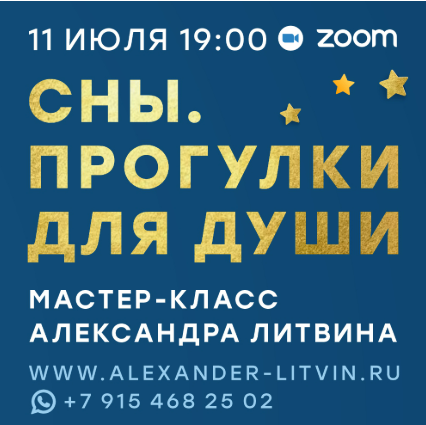 В пятницу 11 июля по вашим многочисленным просьбам в zoom в прямом эфире состоится мастер-класс Александра Литвина "Сны.