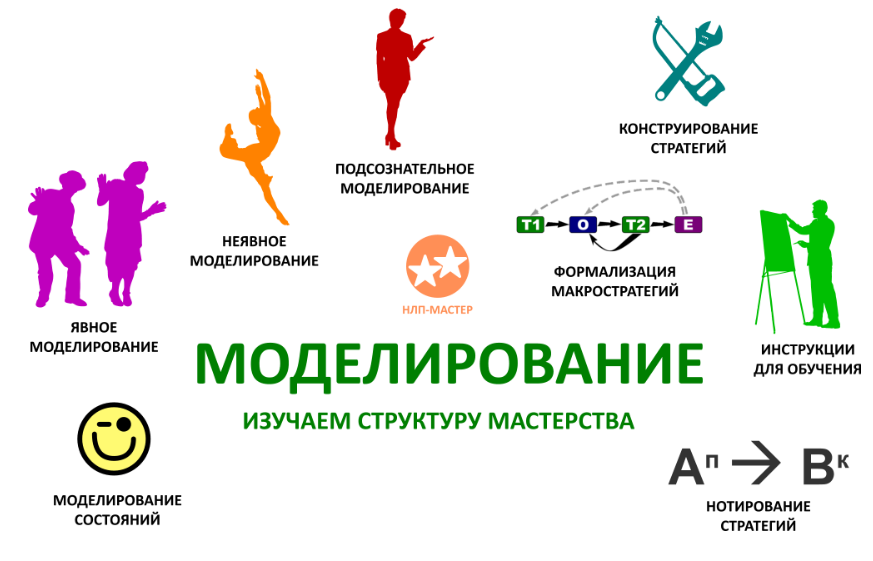 Моделирование - ядро НЛП. При помощи моделирования мы можем "считать" мастерство с другого человека, стать мастером самому и научить других. Большинство моделей и техник в НЛП - это как раз моделирование.