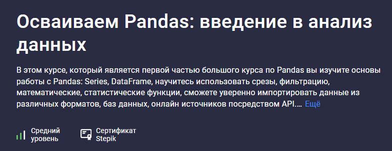 В этом курсе, который является первой частью большого курса по Pandas вы изучите основы работы с Pandas: Series, DataFrame, научитесь использовать срезы, фильтрацию, математические, статистические функции, сможете уверенно импортировать данные из различных форматов, баз данных, онлайн источников...stepik.org