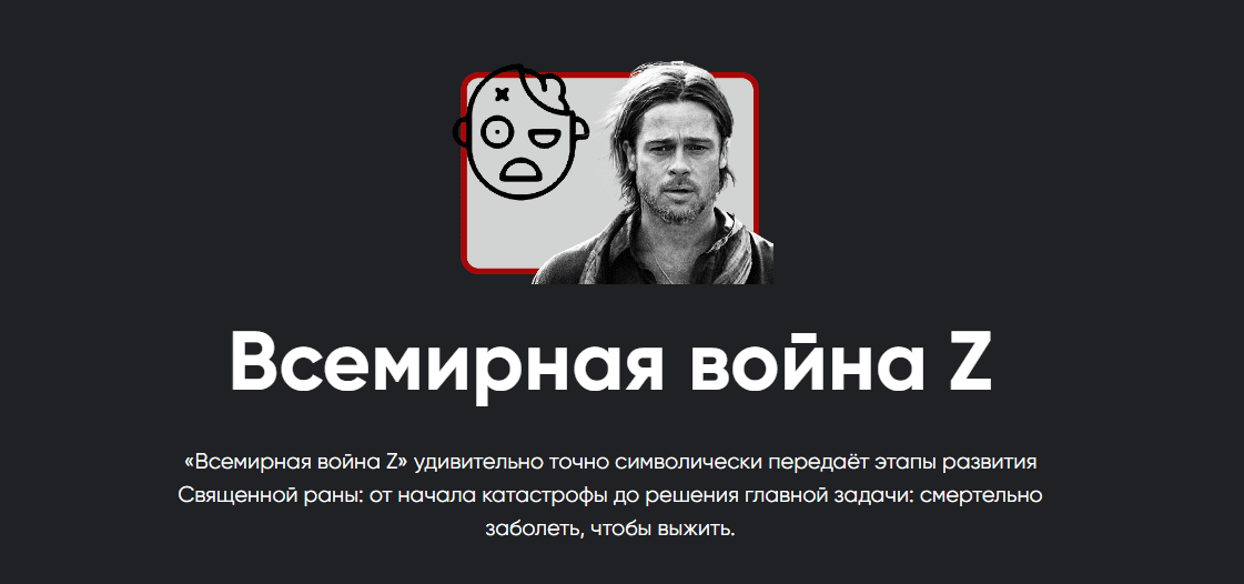 «Всемирная война Z» удивительно точно символически передаёт эти этапы развития Священной раны: от начала катастрофы до решения главной задачи: смертельно заболеть, чтобы выжить.