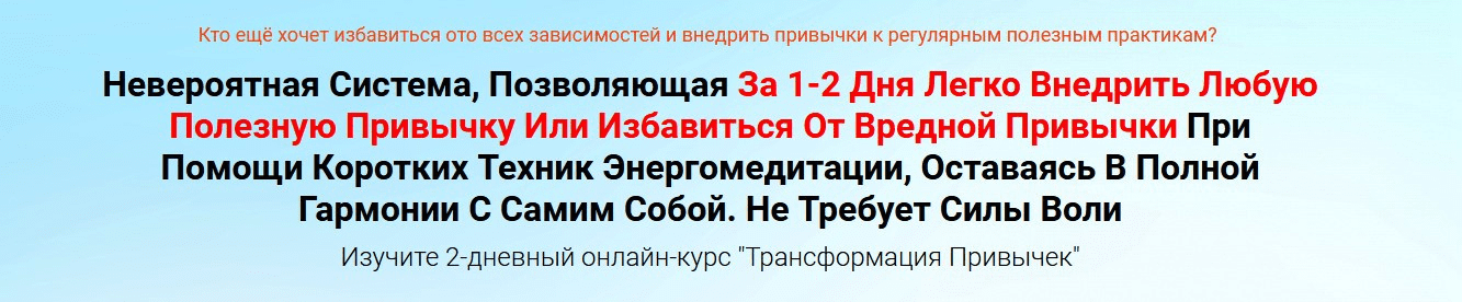 Специально для Вас я упорядочил знания и практики в курсе «Трансформация Привычек», при помощи которых Вы сможете в кратчайшие сроки внедрять в свою жизнь новые полезные привычки и избавляться от вредных.