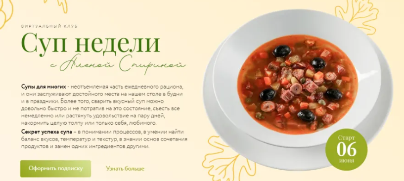 - Таким образом, оплатив членский взнос, вы получаете возможность принимать участие в еженедельный прямых эфирах, получать надежные рецепты, в том числе с использованием сезонных продуктов, обсуждать со мной и с товарищами по Клубу свои проблемы и удачи, связанные с супами.