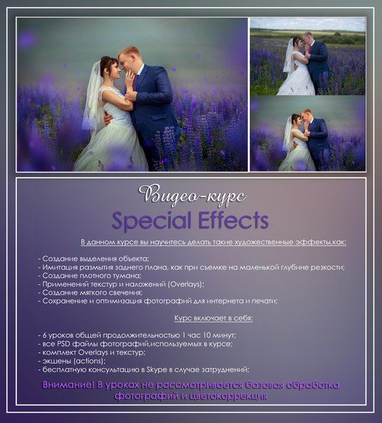 В этом курсе мы не будем разбирать базовую обработку (ретушь кожи, пластику и т.п) и цветокоррекцию, зато мы подробно изучим такие удивительные эффекты для ваших фотографий, как: