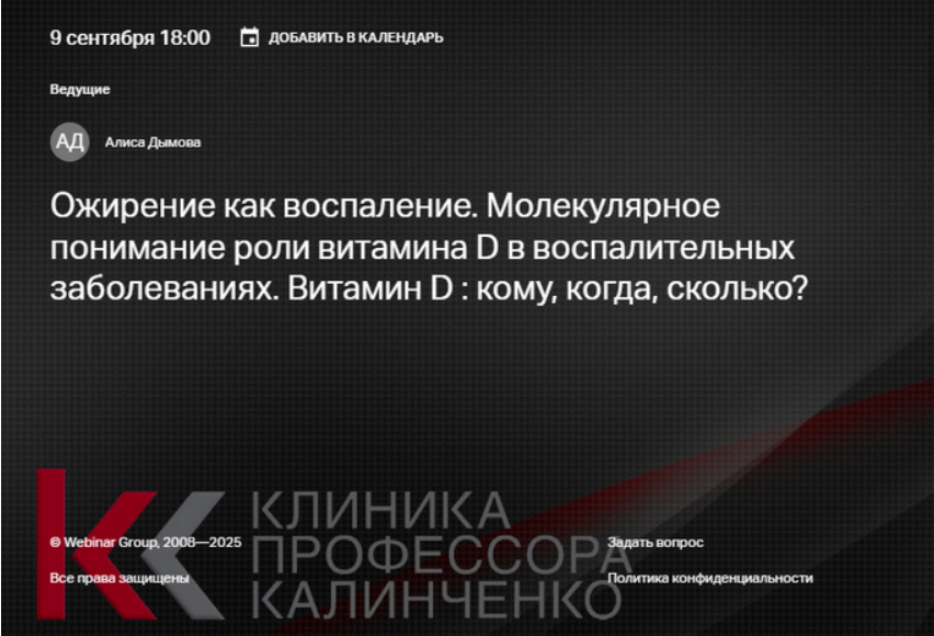 [Алиса Дымова] [Клиника Калинченко] Ожирение как воспаление. Молекулярное понимание роли витамина D. Витамин D - кому, когда, сколько (2025)