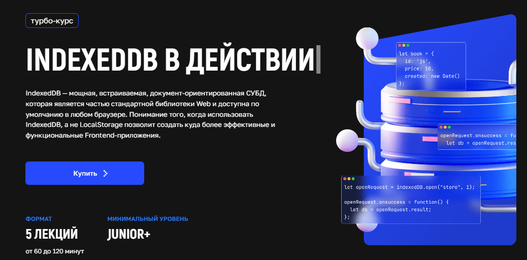 - 3 лекции с детальным разбором API IndexedDB и всех основных нюансов
